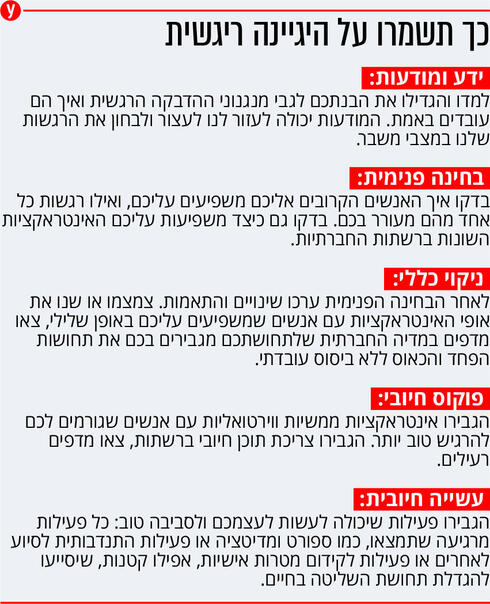 "המלצה נוספת היא להזכיר כל הזמן לעצמנו, וזה בכלל לא עניין טריוויאלי, שלהרבה מהסיפורים הקיצוניים אין משמעות ממשית בחיים שלנו. סטטיסטית, הדברים הקיצוניים שאנחנו רואים ברשתות - לרעה ולטובה - לא יקרו לנו, וזה מאוד עצוב שאלה הדברים שדווקא מקבלים פוקוס ובהם אנחנו עוסקים.
