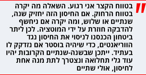 "אנחנו יודעים שבבעלי חיים הרמות של הנוגדנים המנטרלים הצליחו למנוע מחלה גם במקרה של המוטציות, לכן בטווח הקצר אני רגוע. השאלה מה יקרה בטווח הרחוק. האם החיסון הזה יחזיק שנה, שנתיים או שלוש, ומה יקרה אם ניחשף להדבקה חוזרת על ידי המוטציה בזמן שאנחנו עדיין אולי מוגנים מפני הווירוס המקורי. לכן ליתר ביטחון הכנסנו לניסוי את החיסון נגד הווריאנטים, כדי שיהיה בוסטר אם נזדקק לו בעתיד. ברגע שנוכיח שמנה כזאת מעלה חזרה את רמות הנוגדנים בדם, נתחיל לייצר אותה, כי יש כבר מדינות שמעוניינות לשריין לעצמן את האפשרות לחסן פעם נוספת. זה לא יהיה במקום החיסון היום, כי החיסון שנמצא בידינו יעיל נגד הווירוסים שמסתובבים עכשיו, כולל המוטציות. אם נגלה בעוד שנה שאנחנו מחוסנים היטב נגד הווירוס המקורי, אבל רק ב-60% נגד הווריאנטים שלו, מנה שלישית תרים את החסינות חזרה למקום שבו היא צריכה להיות".