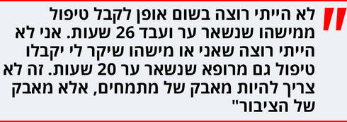 "יותר מהכל אני חושבת שלא הייתי רוצה בשום אופן לקבל טיפול ממישהו שנשאר ער ועבד 26 שעות. אני לא הייתי רוצה שאני או מישהו שיקר לי יקבלו טיפול גם מרופא שנשאר ער 20 שעות. זה לא צריך להיות מאבק של מתמחים, אלא מאבק של הציבור, זה האינטרס שלו. ועובדה היא שיש מודלים בכל העולם שמראים שאפשר אחרת".