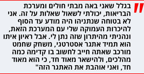 "הרבה אנשים שמגיעים לתפקידים בכירים במערכת הבריאות הם אנשי צבא. זאת תפיסה מאוד מאצ'ואיסטית. הם לא יכולים להגיד, אנחנו לא מסתדרים. והבעיה המרכזית היא שמקבלי ההחלטות בארץ הם חבורה של אנשים שלא חיכתה מימיה בתור למיון או לקופת חולים. אין להם מושג איך זה נראה לאדם מן היישוב. מישהו שהתעלף בבית לא ברור למה הגיע למיון, עשו לו סי־טי לפני שבע שעות והוא עדיין במיון, מהבוקר. אז הם לא מכירים את הדבר הזה, מבחינתם הרפואה בארץ מדהימה. והיא באמת מדהימה בדרכה, אבל יש פה לא מעט בתי חולים ענקיים שבהם יש מסילות לווילונות ושקעים לחמצן במסדרון. החולה במסדרון זאת לא תופעה עונתית, זה כבר חלק ממערך הטיפול".