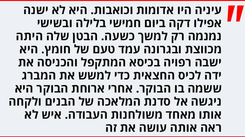 אבל אם תעשה את זה, היא תמשיך להרגיש כמו שהיא מרגישה עכשיו. היא תצטרך לשכב במיטה בלילה כשהאור הבוקע מתחת לדלת מכה בפניה והקולות מהמסדרון הולמים באוזניה והטעם המר ממלא את פיה, ושום דבר לא יקל עליה, שום דבר לא ירפה את גופה. היא אחזה בידית המברג ודפקה בה על שני הברגים הגדולים. לא קרה שום דבר. היא חרקה שיניים וחשבה בריכוז. ואז היא הנהנה בכובד ראש, שינתה את אחיזתה במברג ובעזרת זווית הלהב שלו החלה לקלף את הצבע. זה מה שאבא עשה. היא לחצה בשתי ידיה, בעוד כפות רגליה נטועות היטב על השרפרף, והתקדמה לאורך החריץ. חלק מהצבע השתחרר ממקומו וחשף את המתכת הצהובה של הבורג. היא המשיכה לדחוף בעזרת הזווית החדה של המברג, ועוד צבע השתחרר. ואז נפל גוש גדול של צבע, והחריץ נחשף במלואו.