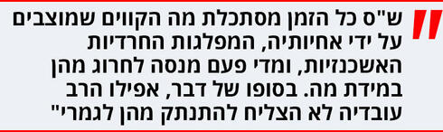 "ש"ס נאמדת בשמונה מנדטים במערכות הבחירות האחרונות, לדעתי הקהל שלה הוא יותר מכפול. חלק ממצביעי ש"ס נמצאים בליכוד. ראינו את הכוח שלה כשהייתה הצבעה בשני פתקים, אחד למפלגה ואחד לראש ממשלה, אז היא פתאום זינקה ל-17 מנדטים. אבל למרות זאת, ש"ס כל הזמן מסתכלת מהם הקווים שמוצבים על ידי אחיותיה, המפלגות החרדיות האשכנזיות, ומדי פעם מנסה לחרוג מהם במידת מה. בסופו של דבר, אפילו הרב עובדיה לא הצליח להתנתק לגמרי. לדוגמה, רצו להקים בבר-אילן פקולטה ל-BA כללי, ובמסגרת ההסכם מי שאמור היה לתת את החסות הרוחנית לפרויקט היה הרב עובדיה. אז היה הסכם, נחתם, וכמה ימים לאחר מכן, הרב עובדיה נסוג מההסכם החתום בעקבות התקפות ופשקווילים מצד האשכנזים. אותה הגמוניה אשכנזית אוחזת בהם עד היום".