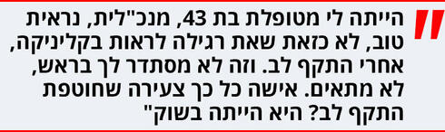 "מגיל 35 גבר עם תעוקת לב שבא למיון או עם קצת זיעה קרה וקוצר נשימה, יודעים לומר שזה התקף לב, אבל במקרה של אישה לא. הייתה לי מטופלת בת 43, מנכ"לית, נראית טוב, לא כזאת שאת רגילה לראות בקליניקה; לא שמנה, בלי בעיות גסטרו, סוכרת, כולסטרול או לחץ דם. והיא מתיישבת, ובהפניה מהרופא כתוב שהיא אחרי התקף לב. וזה לא מסתדר לך בראש, לא מתאים. אנחנו נשים, ממה אנחנו מפחדות? מסרטן. סרטן השד, סרטן בשחלות. אבל שוכחים שיש גם לב. ואישה כל כך צעירה שחוטפת התקף לב? היא הייתה בשוק, זה מטלטל. מי חושבת שהיא תצא למשרד ויהיה לה התקף לב? זה מרגיש כאילו זה לא קשור אלייך".