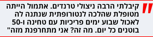 "את מסבירה לה שאת בצד שלה, לטובתה. אמרתי לה, 'תקשיבי, אני לא אעשה אותך שמנה. רק נחזיר את הכמה קילוגרמים שמסכנים את ההתפתחות שלך. רק נחזיר את המחזור. רק ניצמד למשקל המינימלי הבריא'. וזה מה שהיא רצתה לשמוע, שאני לא אשמין אותה".