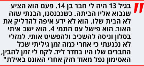"לקח לי זמן להבין שמה שקרה שם היה לא תקין, אבל האסימון שהייתי בסכנה נפל מאוד חזק אחרי האונס באילת. אין לי חברה שזה לא הכה בה. הבנתי שהסיטואציה הייתה יכולה להיגמר אחרת, בין אם היו מצלמים, מצטרפים או סתם שותפים לרגע אינטימי שלי. יש לי המון חברות שנאנסו, כך שאני לא יודעת איך אומרים שזה רק אחת מתוך חמש. יש כאלה שיותר מפעם אחת. לרובן אין מה לעשות עם זה משפטית, כי לפי איך שמערכת המשפט עובדת היום עם הדברים האלה זה ייצור להן יותר עוגמת נפש מתיקון. אני לא רואה איך צדק נעשה, כי במקרים קיצוניים יותר לא קרה מספיק. אם אין לך את ה'מזל' להיאנס בגיל סופר־צעיר או על ידי קבוצה שברור שזה לא בסדר, אז סביר להניח שהמקרה שלך לא יהיה מטופל".