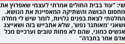 שי: "כל משפט כזה דרדר את הדיכאון. הלב שלי נשרף. מה, נראה לך שאני עצלן? חשבתי שאולי הסרטן חזר. לא דמיינתי שיש לי משהו נפשי. גם היה עניין הסקס. כשהייתי במאניה, כלומר בהיי, היה לי חשק תמיד. בדיכאון לא היה שום חשק לסקס".