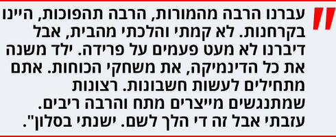 "הלכנו אחרי שרום נולד, לפני חמש וחצי שנים. עברנו הרבה מהמורות, הרבה תהפוכות, היינו בקרחנות. לא קמתי והלכתי מהבית, אבל דיברנו לא מעט פעמים על פרידה. אמרנו, איך מסתדרים. ילד משנה את כל הדינמיקה, את משחקי הכוחות. אתם מתחילים לעשות חשבונות. מה אני עשיתי, מה אתה עשית, מי עובד. הרצונות שמתנגשים מייצרים מתח והרבה ריבים. היינו רבים המון. לא עזבתי אבל זה די הלך לשם. ישנתי בסלון".