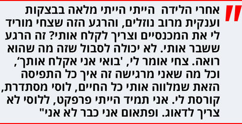 "התפרקתי, אבל הוא אהוב ליבי ואני יודעת שגם לו זה לא פשוט. זה לא הסיבוב הראשון שלו כאבא, יש לו ילד בן 17, דין המהמם, מנישואים קודמים. בסיבוב הראשון שלו כאבא רוב הזמן הוא היה גרוש, הוא קיבל את הילד פעמיים בשבוע ובשאר הזמן היה חופשי. ופתאום הוא בא הביתה, לאישה שקשה לה, לתינוק שבוכה".