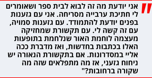 "אני יודעת מה זו גזענות. חוויתי את זה מגיל אפס. אני יודעת מה זה לבוא לבית ספר ושאומרים לי חתיכת ערבייה מסריחה. אני עם גזענות בפנים יודעת להתמודד. עם גזענות סמויה, עם זה קשה לי. עם תקשורת שמחזיקה מעצמה לוחמת האור שנלחמת בתופעות האלו בכתבות בחדשות, ואז מדברת ככה אליי במסדרונות. 12 שנה אני בתקשורת, ואני עדיין מתקשה להאמין שמישהו ששייך לאנשי התקשורת הנאורים, אלו שמביאים בזעזוע בחדשות סיפורי הגזענות, יגיד לי ‘זה רגיל אצלכם’, כי אם בתקשורת הנאורה יש ניחוח גזעני, אז מה אנחנו מתפלאים שזה מה שקורה ברחובות? זה עוד צביעות אחת לאוסף. והניסיון להתחנף לקהל הימני ולפצות אותם על התקשורת השמאלנית מדי? היו שנים ארוכות שכן, התקשורת הייתה שמאלנית, וזה באמת היה מעצבן, שחלק כל כך גדול בציבור לא מקבל שום קול וייצוג, אבל עכשיו? המטוטלת כבר מזמן מאוזנת בצורה כמעט חזקה מדי לימין".