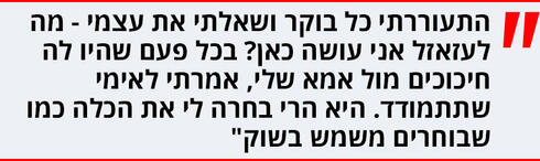 "הייתי עדה לשיחה מהצד אבל לא התערבתי. הייתי בהלם. לא הבנתי איך להגיב, קפאתי. ההורים משני הצדדים ארגנו את החתונה באולם שלא אני בחרתי ובשמלה שאני בקושי בחרתי. הייתי כמו בובה".