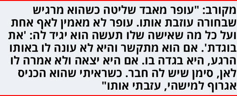 "זאת לא הייתה הפעם הראשונה שעופר השפיל אותי, איים עלי, סטר לי, או בעט בי, ולכן קמתי ועזבתי אותו בסוף".