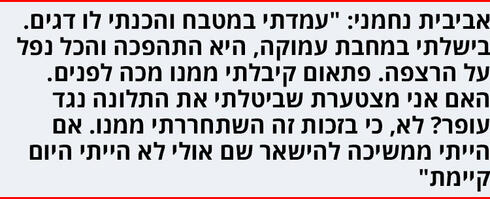 "עמדתי במטבח והכנתי לו דגים. בישלתי במחבת עמוקה, הרמתי את הידיים וכנראה שהידית לא הייתה מחוזקת מספיק, המחבת התהפכה והכל נפל על הרצפה".