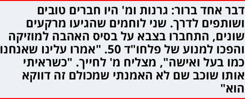 דבר אחד ברור: גרנות ומ' היו חברים טובים ושותפים לדרך. שני לוחמים שהגיעו מרקעים שונים, התחברו בצבא על בסיס האהבה למוזיקה והפכו למנוע של פלחו"ד 50. כל חייל בפלוגה ידע שהרס"פ גרנות וסגנו מ' יעשו בשבילו הכל. אחרי הימים הארוכים בשטח או בבסיס היו נפגשים שניהם בפינת המפל"ג לשיחה קבועה, שמים מוזיקה, מריצים צחוקים ופותרים אחד לשני בעיות. "אמרו עלינו שאנחנו כמו בעל ואישה", מצליח מ' לחייך. "כשראיתי אותו שוכב שם לא האמנתי שמכולם זה דווקא הוא".