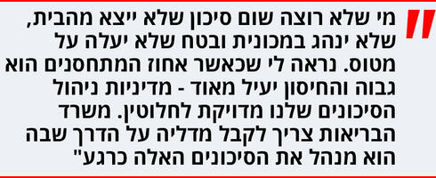 "מי שלא רוצה שום סיכון שלא ייצא מהבית, שלא ינהג במכונית ובטח שלא יעלה על מטוס. נראה לי שכאשר אחוז המתחסנים הוא גבוה והחיסון יעיל מאוד - מדיניות ניהול הסיכונים שלנו מדויקת לחלוטין. משרד הבריאות צריך לקבל מדליה על הדרך שבה הוא מנהל את הסיכונים האלה כרגע. אם אני הייתי צריך להכריע, הייתי מקבל את אותן החלטות".