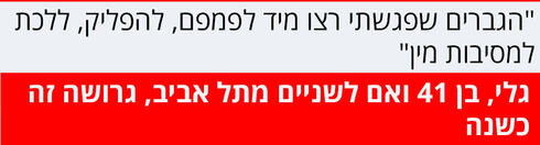 יש גם נשים שמתקדמות נורא מהר. אני רציתי להמשיך לדבר באפליקציה, והן כבר רוצות לדבר בטלפון, להיפגש, לשכב, לסמן וי. גם אם אתה כבר מגיע לשיחה עם בחורה, זה כמו בראיון עבודה. "כמה ילדים יש לך? למה התגרשת? מתי אתה נפגש עם הילדים? במה אתה עובד? כמה אתה מרוויח? יש לך בית?" אולי אשלח לה את קורות החיים שלי וזהו?