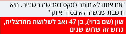 דברים השתנו ב־15 השנים שלא הייתי בשוק. בשנה מאז שהתגרשתי יצאתי עם שבעה גברים. עם שישה מהם שכבתי. ארבעה מהם חתרו לסקס לא קונבנציונלי בדייט הראשון. אחד ביקש לסיים כמו שמסיימים בפורנו. הסכמתי, בכל זאת דייט ראשון. שתינו שתי כוסות יין אדום וסיפרנו על האקסים שלנו והילדים שלנו. הגברים הגרושים של 2021 הם לא הנערים של 2006.