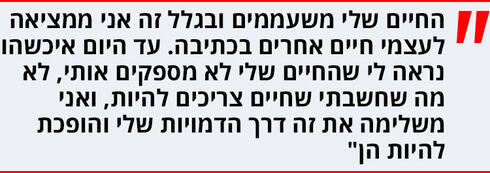 "כן, אני חייבת לחיות חיים כפולים — גם את החיים שלי וגם את החיים של הגיבורים שלי. אבל במקום הראשון זה ילדים, נכדים ובעל, ורק בשאר הזמן אני הדמויות שאני בודה. סופרים רבים לא מתפקדים כהורים. הם חיים את הכתיבה. ראיתי את הסרט על דבורה עומר ובכיתי. אמרתי איזה חיים טובים היו לה ששמוליק לקח על עצמו את הכל. אצלי כשמפריעים לי באמצע פרק, אני עוזבת את הכתיבה, למרות שהכתיבה מצילה לי את החיים".