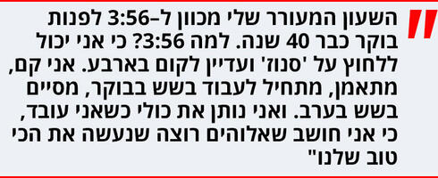 "בחיים צריך אישה כמו שלי שתגיד, 'יש ארוחת ערב בשש, אני מצפה שתסיים עד אז'. כולנו צריכים למצוא את הדרכים שיאפשרו לנו להחזיר את הגבולות האלה לחיים שלנו, גם אם הדברים נהיו מאוד גמישים. זה קל להגיד וקשה לעשות, ועדיין, אשתי יודעת שבימי שבת אני נמצא – למרות העבודה החדשה ו־14 אלף עובדים בישראל ו־110 אלף ברחבי העולם, שבת הוא היום שלה. ובששת הימים האחרים – כן, אני זמין 24/7".