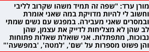 "כשהייתי מייעצת באתר אינטרנט, עניתי על 20 אלף שאלות. הרבה פעמים נערים ונערות כתבו 'כוס' ו'זין' כי אין להם מילים אחרות, ואני הייתי עונה ב'פות' ו'פין' ובסוגריים כותבת: 'אלו המילים התקניות שאני מעדיפה להשתמש בהן'. גם בקבוצות שאני מעבירה יש לי כללים. אני אומרת 'אתם יכולים להגיד הכול, אבל יהיו מילים שאני אסמן לכם לנסח מחדש, והן 'לזיין' שאני לא מוכנה לשמוע, 'כוס' ו'זין'. זה חשוב לי כי זה לתת דוגמה, תרגול וחינוך".