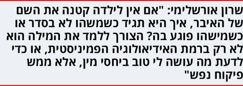 "הדוגמה הכי מוחשית שלי לשינוי זה אצל בן זוגי. לפני שנתיים פתאום שמעתי אותו אומר את המילה 'פות', לא זוכרת באיזה הקשר, אולי של אחת הבנות. הוא אמר את זה באגביות כזו, וממש טפחתי לעצמי על השכם, כי זו העבודה – לגרום לזה להיות נוח בבית".