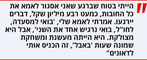 "שתביני", הוא ממשיך, ומשהו בחזות המחוספסת שלו נסדק, "אני חייב להרים אותם, להוציא אותם מהחרא. אבל אמא שלי היא כמו כלב קרבות שכשבאים ללטף אותו נכנס למצב תקיפה. היא חרדה על הבוילר, על תשלומי חשבונות. ואז הגיעה ההצעה ל'אח הגדול' והבנתי שיש לי הזדמנות שאולי המשפחה שלי תשמע אותי. אבל זה לא הסתיים כפי שרציתי, כל כך רציתי סוף אחר. לצאת רגיל, גם אם במקום השמיני. הבנתי שבעטתי בדלי של עצמי, שנייה לפני הסוף".