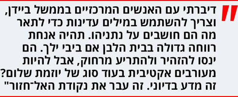 "דיברתי עם האנשים המרכזיים בממשל ביידן לפרויקט הבא שלי, וצריך להשתמש במילים עדינות כדי לתאר מה הם חושבים על נתניהו. תהיה אנחת רווחה גדולה בבית הלבן אם ביבי ילך. כרגע אין להם שום סיבה לנסות להיכנס מחדש לתהליך. הם ינסו להזהיר ולהתריע מרחוק, אבל להיות מעורבים אקטיבית בעוד סוג של יוזמת שלום? זה מדע בדיוני. זה עבר את נקודת האל־חזור".