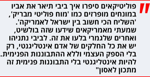 "פוליטיקאים מהעבר שעבדו עם ביבי וגם הכירו את בנציון, סיפרו איך ביבי תיאר את אביו במונחים מופרזים כמו 'מוח פוליטי מבריק', 'השליח הכי חשוב בין ישראל לאמריקה', 'הוא עבד בשביל המוסד ובן־גוריון כמרגל באקדמיה'. שמעתי מאמריקאים שידעו שזה בולשיט, ואחרים שלגמרי בלעו את זה. לביבי נתניהו יש את כל החלקים של אדם אינטליגנטי, רק בלי הספק העצמי וללא ההתבוננות הפנימית. להיות אינטליגנטי בלי התבוננות פנימית זה מתכון לאסון".