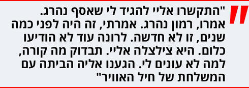 "היא צלצלה אליי. תבדוק בחיל האוויר מה קורה, למה לא עונים לי. אני מצלצלת, לא עונים לי. לא עונים לי. לא עונים לי. אני גם מזניק את אשתי. היא פסיכולוגית. היא חברה של רונה. שנינו נוסעים אליה הביתה ומגיעים עם המשלחת של חיל האוויר. שם אני מוציא כרטיס אדום לעיתונאים. באמת, זה לא נכון להתייצב שם מול הבית כשהיא לא יודעת מה קורה. אני בקשר מצוין עם הילדים היום".