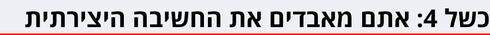 ככל שהחרדה ממושכת ועמוקה יותר, כך היא משתקת את היצירתיות. המשאבים הרגשיים והאינטלקטואליים נוטים לנתב את עצמם למקור החרדה. כתוצאה מכך אתם עלולים להרגיש שהראש ריק ממחשבות יצירתיות, מה שמעצים את חוויית התסכול ועלול לגרום לכם לאבד את האמון שלכם בעצמכם. לפעמים החרדה עלולה לנבוע מהפחד שהרעיון שאתם רוצים להעלות במקום העבודה יתקבל בביטול ויגרום לכם למבוכה. מהסיבה הזאת אתם נמנעים מראש להביא אותו. מה עושים: