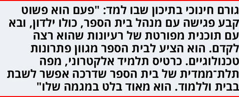 הגורם החינוכי מספר גם, כי הצעיר המוכשר "דיבר נורא־נורא מהר, כי ככה הוא גם חשב. זה לא היה קצב של אדם רגיל. בזמן שהחברים שלו חרשו לבגרויות הוא כבר למד באוניברסיטה. הוא היה יזם בנשמתו. הוא כל הזמן חשב איך אפשר לעשות דברים אחרת, בצורה יותר יעילה וטובה. הרגשנו שאנחנו לא בקצב שלו".