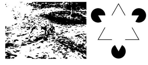 באיור הראשון רוב הצופים רואים אך ורק כתמים מקריים עד שאומרים להם שבתמונה מופיע כלב דלמטי, ואז לפתע המוח של רוב הצופים משלים את הגבולות החסרים והקומפוזיציה כולה מקבלת משמעות. האשליה הזאת מוכרת מאז שנות ה־1960, אך דומה שאיש לא תיעד את יוצרה. לאיור השני, לעומת זאת, יש היסטוריה ידועה. הוא נקרא משולש קניצה, על שם הפסיכולוג האיטלקי גטאנו קניצה שיצר אותו בשנת 1955. בתמונה אין כמובן שום משולש, מלבד זה שמוחכם הציב בה.