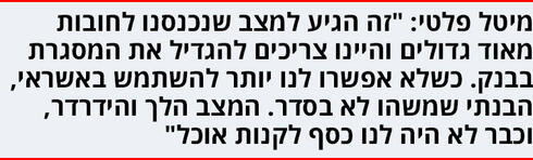 "במצב מעולה. יש לנו חסכונות. אין לנו חובות בכלל. יש לי רק כרטיס אשראי אחד והוא לדברים ספציפיים, כמו חשבון טלפון ודברים שאי אפשר לשלם במזומן. אני קונה בדיוק מה שאנחנו צריכים. נניח הקטנה שלי צריכה במהלך השבוע שלוש חליפות גן ושתי שמלות - זה בדיוק מה שאני קונה לה, ואני קונה בחנויות זולות יותר ובמבצעים, כי אני מבינה שיש לי שלושה ילדים ואני צריכה לקנות בכמויות".
