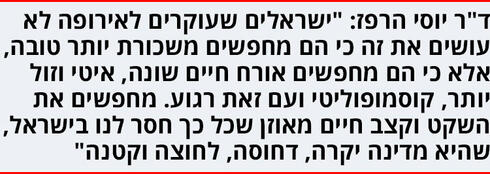 "ישראלים שעוקרים לאירופה לא עושים את זה כי הם מחפשים משכורת יותר טובה, אלא כי הם מחפשים אורח חיים שונה, איטי וזול יותר, קוסמופוליטי ועם זאת רגוע. מחפשים את השקט וקצב חיים מאוזן שכל כך חסר לנו בישראל, שהיא מדינה יקרה, דחוסה, לחוצה וקטנה. הכול סיר לחץ אצלנו, ואין מרחבי אפשרויות. אם היינו בגודל של ארצות הברית אנשים אולי היו מוצאים את הפינות בתוך המדינה, כי תראי כמה מעט אמריקנים עוזבים את ארצות הברית. יש להם מגוון אופציות לסגנונות חיים, והם לא צריכים לצאת מהמדינה כדי למצוא את עצמם. אבל מי שמחפש קצב אחר אצלנו, לא ימצא אותו בארץ".