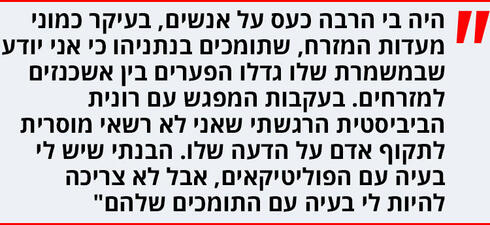 "הסיבה העיקרית לביקורת שלי על נתניהו הייתה מה שראיתי כאבא של ילד אוטיסט. ממשלות נתניהו היו מהגרועות ביותר לבעלי מוגבלויות בארץ והזדעזעתי מאפס העניין שהפגינו בליכוד לגבי הנושאים האלה. עצם זה שמנסים לפגוע בך כלכלית, ואפילו לא בגלל דעה פוליטית אלא כי אתה מבקר את ביבי, זה חמור מאוד. אגב, אני לא שמאל כמו שחושבים. אבא שלי לקח אותי כילד לראות את מנחם בגין נואם. אבל בסיטואיה שביבי יצר פה, אם אתה נגדו, זה אומר שאתה נגד כל הימין. אגב, גם החרדים לא ימין בעיניי. אנשים שמתנגדים לגיוס לצה”ל רחוקים מלהיות ימנים”.