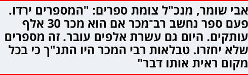 "זה נכון שהמספרים ירדו. פעם ספר נחשב רב־מכר אם הוא מכר 30 אלף עותקים. היום גם עשרת אלפים עובר. בעבר היינו מוציאים מיד מאה אלף אבל אלה מספרים שלא יחזרו. יש ירידה של מכירות. טבלאות רבי־המכר היו ספר התנ"ך כי בכל מקום ראית אותו דבר. בין אם זה עמוס עוז או מאיר שלו או מיכל שלו, בכל המקומות היו נתונים די דומים. ואנחנו מעבירים רק לפי המכירות האמיתיות".