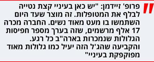 "מדובר במוצר מעניין שהולך טוב עם הטרנד האנטי־הורמונלי ועשוי להביא לשיפור במצבים שונים כמו מניעת מחלות מין וטיפול בדלקות מקומיות", אומר פרופ' זיידמן. "אני בעד כל דבר שמגדיל את האפשרויות שלנו למנוע היריון לא רצוי. מצד שני, יש כאן בעיניי קצת נטייה לבלף את המטופלות. מספרים להן חצאי אמיתות. קודם כל, זה מוצר שעד היום השתמשו בו מעט מאוד נשים. החברה מדווחת שמכרה 17 אלף מרשמים, שזה בערך מספר חפיסות הגלולות שנמכרות בארה"ב כל רגע. אין כאן פרופורציות בין הניסיון שקיים לגבי אמצעים אחרים למוצר החדש.