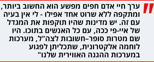 "מערכות ל"א (לוחמה אלקטרונית) שהיו במגדל, שתכליתן לפגוע במערכות ההגנה האווירית שלנו. מי שצריך להגיד תודה על יעילותן של מערכות ההגנה האווירית שלנו, זה קודם כל חמאס. אם הן לא היו עובדות אצלנו, וכל מה שיורט היה פוגע בעורף הישראלי, כל המידתיות הייתה נעלמת וזה גם היה נתפס ומתקבל כלגיטימי. הייתי מפיל את המגדל בלי לפנות אותו".