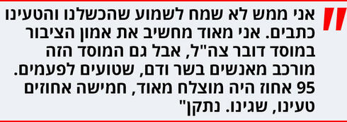 "יש הרבה במה להתגאות, אבל אני ממש לא שמח לשמוע שהכשלנו והטעינו כתבים. אני מאוד מחשיב את אמון הציבור במוסד דובר צה"ל, אבל גם המוסד הזה מורכב מאנשים בשר ודם, שטועים לפעמים. 95 אחוז היה מוצלח מאוד, חמישה אחוזים טעינו, שגינו – נתקן".