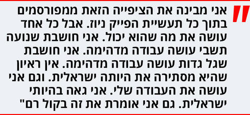 "פירסמתי את מה שיכולתי. לא רציתי יותר מזה, זאת האמת. העדפתי להמשיך את מה שאני עושה יותר ברמה האישית. אני מבינה את הציפייה הזאת ממפורסמים בתוך כל תעשיית הפייק ניוז. אבל כל אחד עושה את מה שהוא יכול. אני חושבת שנועה תשבי עושה עבודה מדהימה. אני חושבת שגל גדות עושה עבודה מדהימה. אין ראיון שהיא מסתירה את היותה ישראלית. וגם אני עושה את העבודה שלי. אני גאה בהיותי ישראלית. גם אני אומרת את זה בקול רם. אני טסה עכשיו עם ‘אסיה’ לארצות־הברית ואני אמשיך לדבר עם אנשים ולהעמיד אותם על טעותם. אבל אני לא אתחיל להיות חיית אינסטגרם או וכחנית פוליטית. לא מפחדנות. אני פשוט לא כזאת”.