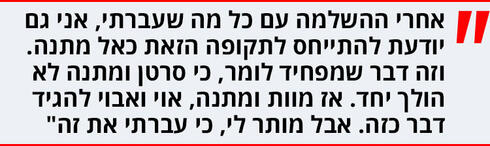 "חלק מבינים את זה בגיל מוקדם. חלק מבינים את זה בגיל יותר מאוחר. אני הבנתי את זה בגיל צעיר מאוד. נולדתי לתוך זה. הזיכרון הראשון שלי הוא בית חולים. אין לי זיכרון במוח שהוא לפני הדבר הזה. אני אפילו לא יכולה להגיד שלפני זה הייתי ילדה. הייתי כמעט בת שלוש כשזה קרה. זה ממש משהו שהוא חלק ממני בכל השנים האלה ועכשיו, אחרי ההשלמה עם כל מה שעברתי, אני גם יודעת להתייחס לתקופה הזאת כאל מתנה. וזה דבר שמפחיד לומר, כי סרטן ומתנה לא הולך יחד. אז מוות ומתנה, אוי ואבוי להגיד דבר כזה. אבל מותר לי, כי עברתי את זה".