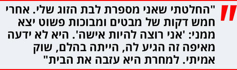 "התגובה שלה הייתה קשה. היא לא ידעה מאיפה זה הגיע לה, הייתה בהלם, שוק אמיתי. היה לה סוג של חיוך של 'לא מאמינה כזה', של 'מאיפה זה נפל עליי עכשיו'. אחרי השיחה יצאתי מהבית, עשיתי סיבוב ארוך וכשחזרתי דיברנו, היא שאלה שאלות על הזוגיות שלנו, רצתה להבין עם מי הייתה כל השנים האלה. זה מאוד לגיטימי ואני מבינה את המקום שלה ואת השאלות ואת הרצון שלה לדעת. יום למחרת היא עזבה את הבית".