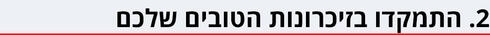 מה מייחד אנשים מאושרים? הזיכרונות שלהם. מחקרים מצאו שאנשים שמרבים לדבר על הזיכרונות שלהם, בעיקר החיוביים שבהם, מאושרים יותר ומרוצים מחייהם. לעומת זאת, אנשים שמתרכזים בזיכרונות הרעים שלהם, או לא עוסקים בזיכרונות כלל, מאושרים פחות. לכן ההמלצה בספר החדש היא להשקיע בזיכרונות הטובים ולדבר עליהם באריכות. נמצא גם שהזיכרונות המאושרים ביותר שלנו מערבים ברוב המקרים אנשים נוספים. זה לא חייב להיות אירוע רב משתתפים, אלא גם רגע אחד שבו הילדה שלכם אומרת לכם בפעם הראשונה שהיא אוהבת אתכם או מצהירה שהיא ממש מאושרת.