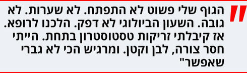 "הגוף שלי פשוט לא התפתח. לא שערות. לא גובה. כולם מתחילים לקבל צורה ולגלות את המיניות שלהם, בזמן שאני עד י"ב תקוע על 1.50 מטר. לא פופולרי. לא אטרקטיבי. קינאתי ביפים, באלה שהבנות מתעניינות בהם. השעון הביולוגי לא דפק. הלכנו לרופא. אז קיבלתי זריקות טסטוסטרון בתחת.