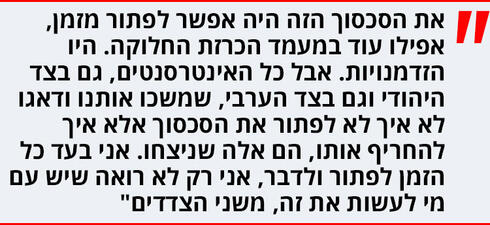 "אני אומר שאת הסכסוך הזה היה אפשר לפתור מזמן, אפילו עוד במעמד הכרזת החלוקה. היו הזדמנויות, עוד במעמד של יומיים אחרי מלחמת ששת הימים, שאני חוויתי אז בהגעה של לוי אשכול לבית של סבא שלי. אבל כל האינטרסנטים, גם בצד היהודי וגם בצד הערבי, שמשכו אותנו ודאגו לא איך לא לפתור את הסכסוך אלא איך להחריף אותו, הם אלה שניצחו. אני בעד כל הזמן לפתור ולדבר, אני רק לא רואה שיש עם מי לעשות את זה, משני הצדדים".