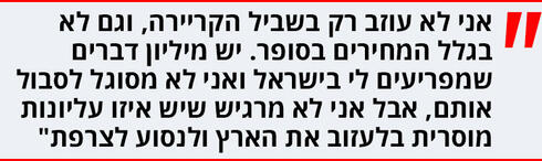 "זה נכון. אני מדבר על אנשים צעירים, צעירים ישראלים - אני חושב שלהרבה מהם ייטב לנסוע. אבל אני לא מרגיש שאני יכול לבוא ולהגיד, בואו חברים, תעזבו את ישראל, זה הדבר הנכון. זה הדבר הנכון לעשות לי, למשפחה שלי, ברגע הזה. אז אני אומר, ולו גם בשביל להסתכל על השמש לא דרך הפריזמה של החדשות בארץ, צריך לנסוע מפה".