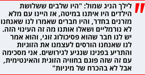 "היו שלבים ששלושת הילדים היו איתנו במיטה, אז היינו עם מלא מזרנים בחדר והיו חברים שאמרו לנו שאנחנו לא נורמליים ושאלו אותנו מה זה העינוי הזה", משתפת הניג שמול. "יש לנו חבר שהוא פסיכולוג זוגי, והוא אמר לנו שאנחנו הורסים לעצמנו את הזוגיות והתריע בפנינו שנגיע לגירושים. אני מסכימה עם זה שזה פוגם בחוויה הזוגית והאינטימית, אבל לא בהכרח של מיניות.