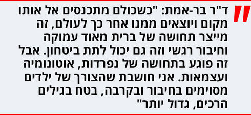 "אנחנו תמיד מדברים על יתרונות וחסרונות. כל בחירה נותנת משהו אחד ולוקחת משהו אחר. כשכולם מתכנסים אל אותו מקום ויוצאים ממנו אחר כך לעולם, זה מייצר תחושה של ברית מאוד עמוקה וחיבור רגשי, וזה גם יכול לתת ביטחון, אבל זה פוגע בתחושה של נפרדות, אוטונומיה ועצמאות. אני חושבת שהצורך של ילדים מסוימים בחיבור ובקרבה, בטח בגילים הרכים, גדול יותר, אבל זה גם יכול להשתנות בין ילד לילד וגם בין הורה להורה".