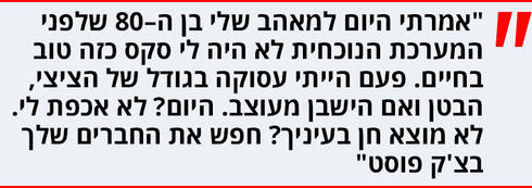 אם יש משהו שכולם מסכימים עליו זה שהסטיגמה הנפוצה שבגיל מאוחר כבר אין סקס לא נכונה בכלל. להפך, עם הגיל גם בא ניסיון וגם ויאגרה אם צריך. "זה אולי יפתיע אותך, אבל אמרתי היום למאהב שלי בן ה־80 שלפני המערכת הנוכחית לא היה לי סקס כזה טוב בחיים", אומרת נאווה. "אני אגיד לך למה. יש בגיל הזה את המודעות שלך למה שבאמת עושה לך טוב. אני אומרת גם שאני כבר לא עושה משהו כדי למצוא חן. פעם הייתי עסוקה בגודל של הציצי, הבטן ואם הישבן מעוצב או לא. היום? לא אכפת לי. לא מוצא חן בעיניך? חפש את החברים שלך בצ'ק פוסט. לי היום יש יותר מחזרים מאשר בגיל 20 כי אני אישה שהיא מינית ובוטחת במיניות שלה. אני משדרת נינוחות עם עצמי ויודעת שאני שווה".