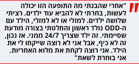 "אחרי שהבנתי מה התופעה הזו יכולה לעשות, בחרתי לא להביא עוד ילדים, כדי לא לסכן ילד חף מפשע. רציתי שלושה ילדים. למזלי או לא למזלי, הילד עם ה-ODD נולד ראשון והחלטתי בצורה מודעת, עוד כשהייתי עם בן הזוג שלי, שסיימתי. זה ילד שצריך 7/24 ממני. אז נכון, זה לא כיף, אבל אני לא רוצה שייקחו לי את הילד. אני רוצה לקחת את מלוא האחריות. אני בוחרת לשאת בה".