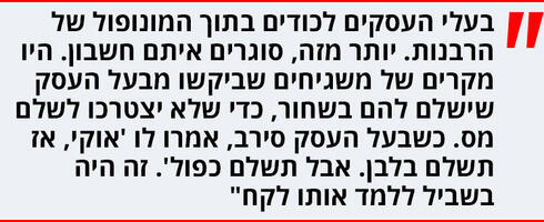 “בעלי העסקים לכודים בתוך המונופול של הרבנות”, הוא מאשים, “יותר מזה, סוגרים איתם חשבון. היו מקרים של משגיחים שביקשו מבעל העסק שישלם להם בשחור, כדי שלא יצטרכו לשלם מס. כשבעל העסק סירב, אמרו לו ‘אוקיי, אז תשלם בלבן. אבל תשלם כפול’. זה היה בשביל ללמד אותו לקח. יש גם מקרים של רבנים, שמחמירים עם בית עסק כזה או אחר, ממש התעללות, כי לרב יש אינטרס אצל המתחרה. ראיתי את הדברים האלה”.